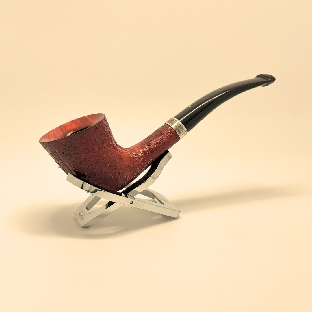 The Dunhill Ruby Bark Group 4 4135 is a beautifully executed example of Dunhill’s signature craftsmanship, distinguished by its deep ruby-stained sandblast that brings rich texture and grain to life. The tall, slightly flared bowl offers an elegant profile while providing excellent heat distribution, making it as functional as it is visually striking. A polished sterling silver band adds a refined accent and reinforces the pipe’s premium character, while the gently bent black stem ensures a balanced, comfortable hold. As part of the Ruby Bark line—one of Dunhill’s most eye-catching finishes—this Group 4 4135 shape stands out as a sophisticated, collectible piece for enthusiasts who value both artistry and tradition.