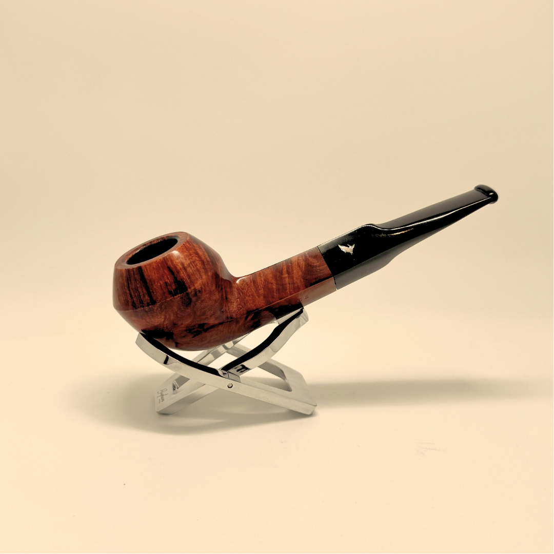 Fenice Rhodesian is a bold, well-defined classic shape from the Fenice series by Italian artisan Alessandro Lorenzetti. Recognized by its squat, rounded bowl and subtle twin bead lines, the Rhodesian offers a comfortable hand feel and a focused, satisfying smoke. The shape showcases the character and depth of the briar, enhanced by a warm, polished finish and paired with a sleek black stem for a timeless, balanced presentation. As with all Fenice pipes, each Rhodesian is entirely handmade, with subtle variations that make every pipe uniquely its own.